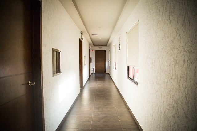 Si avanzas a través de la entrada encontrarás un pasillo donde se encuentran las cocheras eléctricas de las habitaciones y como en cualquier motel, metes tu auto y subes al cuarto.